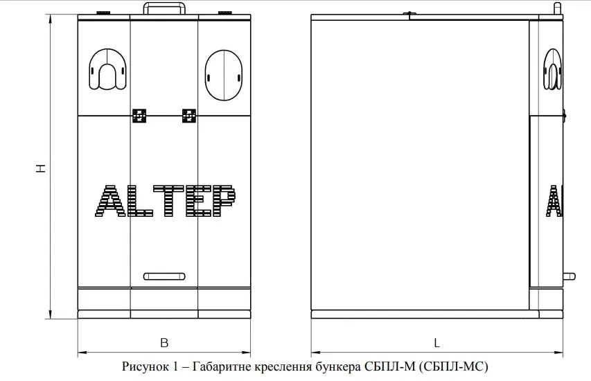 Бункер Об’єм бункера, л Габаритні розміри бункера, мм B, мм L, мм L1, мм H, мм (без коліс) масса, кг СБПЛ-300 300 690 1005 907 1210 85 СБПЛ-500 500 690 1005 907 1580 95 СБПЛ-700 700 690 1265 1167 1580 115 СБПЛ-1000 1000 1010 1265 1167 1580 145 СБПЛ-1500 1500 1250 1500 1405 1580 180