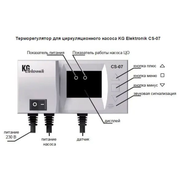 KG Elektronik CS-07 це електронний регулятор, призначений для управління циркуляційним насосом центрального опалення Він включає насос коли температура котла перевищує задану межу і вимикає коли котел охолоджується Це дозволяє уникати роботи насоса коли нема потреби заощаджувати енергію та продовжити термін служби обладнання