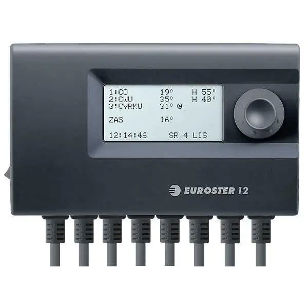 Контролер Euroster 12 — це трьохканальний електронний прилад із тижневим програматором, створений для управління трьома пристроями в системі опалення. Можливі режими кожного виходу: насос для центрального опалення, насос для ГВП, циркуляційний насос ГВП, тепла підлога, вентилятор або режим термостата / тимчасової роботи. Пристрій підтримує конфігурацію пріоритету ГВП, дозволяє задавати графіки роботи окремо для кожного виходу на тиждень, має захист від перегріву контурів, а також функцію Анти-Стоп для захисту насосів від тривалого простою без роботи. Інтерфейс відповідає за зручне налаштування температурних порогів через поворотну ручку з кнопкою на яскравому РК-дисплеї. Технічні характеристики Виробник: Euroster, Польща Напруга живлення: 220-240 В Споживана потужність: близько 3 Вт Максимальний діапазон вимірювання температури: до ~99 °C Діапазон встановлюваної температури: приблизно +10…+90 °C Кількість керованих релейних виходів: 3 Застосовність виходів: насос ЦО, насос ГВП, тепла підлога, вентилятор, термостатний режим Функція Анти-Стоп: так Захист від перегріву контурівEuroster 12 — Автоматика для твердопаливних котлів