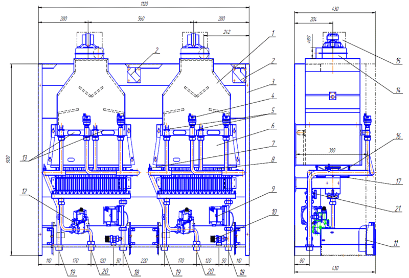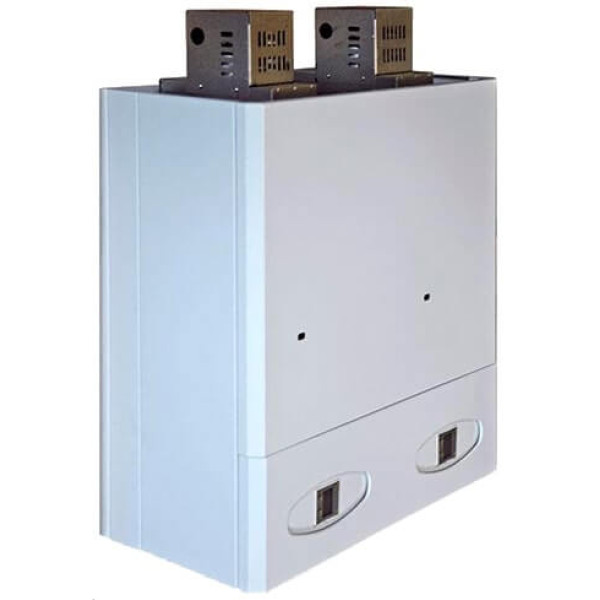 Це серія турбованих навісних газових котлів потужністю 100 кВт - з електронним керуванням, які можна підключати каскад. Колві Eurotherm Technology 100 EST - має двоблочну конструкцію - два котли 50EST. Дані котли використовують як джерело теплопостачання споруд, де системи опалення водяного типу. Вони підходять для обігріву житлових будинків та виробничих будівель, які мають димар і можуть відводити продукти згоряння. Ці котли мають насос, розроблений для систем опалення, що мають штучну циркуляцію води. При використанні спеціального клапана можлива робота цих котлів на бойлер з великою ємністю. У кожному апараті є пристрій захисту, який забезпечує користувачу повну безпеку. Воно перешкоджає шкідливим викидам продуктів згоряння в приміщення, а також попаданню газу в топку котла, коли не відбувається процес горіння. 1. Перетворювач тиску; 2. Температурний зонд; 3. Аварійний термостат; 4. Повітровідвідник; 5. Тягопереривник; 6. Теплообмінник; 7. Водоохолоджувальний пальник; 8. Реле протоки; 9. Циркуляційний насос; 10. Запобіжний клапан; 11. Газова арматура; 12. Відцентровий вентилятор. 1 - тягопереривник; 2 – моностат; 3 – рама апарату; 4 - повітровідвідник; 5 – аварійний термостат; 6 – камера згоряння; 7 – температурний зонд; 8 - пальник; 9 – циркуляційний насос; 10 - запобіжний клапан; 11 – блок автоматики; 12 – газовий клапан; 13 – теплообмінник; 14 – вентилятор; 15 - кожух вентилятора (димососу); 16 - екран пальника; 17 - рамка пальника; 18 - патрубок G1” введення води після системи опалення (обратка); 19 - патрубок G1 виходу води в систему опалення (подача); 20 - патрубок подачі газу G3/4"; 21 - реле протоки.Газові котли Колви Eurotherm Technology 100 ESТ