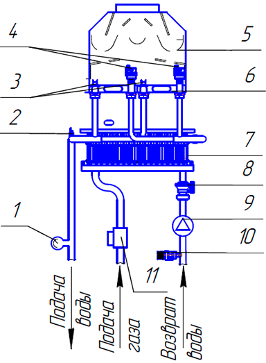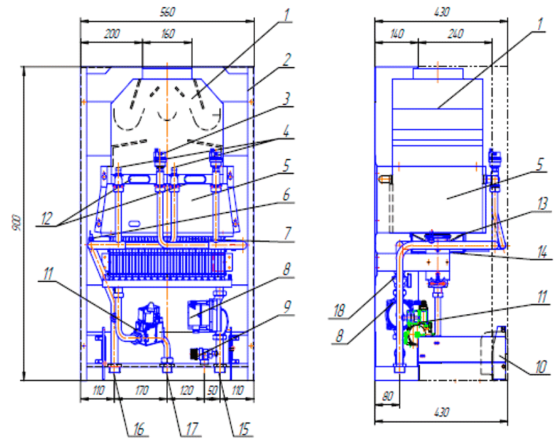 Це серія димохідних навісних газових котлів потужністю 50 кВт - з електронним управлінням, які можна підключати каскад. Дані котли використовують як джерело теплопостачання споруд , де системи опалення водяного типу Вони підходять для обігріву житлових будинків та виробничих будівель, які мають димар і можуть відводити продукти згоряння. Ці котли мають насос, розроблений для систем опалення, що мають штучну циркуляцію води. При використанні спеціального клапана можлива робота цих котлів на бойлер з великою ємністю. У кожному апараті є пристрій захисту, який забезпечує користувачу повну безпеку. Воно перешкоджає шкідливим викидам продуктів згоряння в приміщення, а також попаданню газу в топку котла, коли не відбувається процес горіння. 1. Перетворювач тиску; 2. Температурний зонд; 3. Аварійний термостат; 4. Повітровідвідник; 5. Тягопереривник; 6. Теплообмінник; 7. Водоохолоджувальний пальник; 8. Реле протоки; 9. Циркуляційний насос; 10. Запобіжний клапан; 11. Газова арматура. 1 - тягопереривник; 2 – рама апарату; 3 - повітровідвідник; 4 – аварійний термостат; 5 – камера згоряння; 6 – температурний зонд; 7 - пальник; 8 – циркуляційний насос; 9 - запобіжний клапан; 10 – блок автоматики; 11 – газовий клапан; 12 – теплообмінник; 13 - екран пальника; 14 – рамка пальника; 15 - патрубок G1” введення води після системи опалення (обратка); 16 - патрубок G1” виходу води у систему опалення (подача); 17 - патрубок подачі газу G3/4"; 18 - реле протоки.Газові котли Колви Eurotherm Technology 50 ES