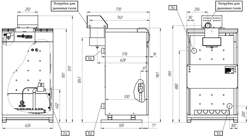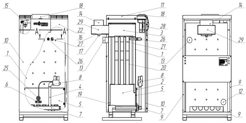 Це серія турбованих підлогових газових котлів потужністю 50 кВт - з електронним управлінням, які можна підключати каскад. Газовий котел Колвітерм КТН 50 CEТ – підлоговий котел з електрокеруванням Котел підлоговий Колві оброблений актуальним дизайном, а також гарною обшивкою, яку виробляють за допомогою італійського та німецького обладнання, застосовуючи при цьому порошкове фарбування (нанесення на металеві поверхні порошку з подальшим утворенням шару в печах полімеризації). Усередині котлів знаходяться запатентовані серії теплообмінники особливої будови. Опалювальне обладнання включає зручний пульт управління, газову автоматику (італійського та німецького виробництва), а також інжекційний пальник. Все це робить котли Колві максимально продуктивними та надійними під час робочого процесу. Котли Колві мають три типи газових клапанів, зроблених у Німеччині та Італії. Ще один плюс даних котлів – завдяки модуляційній автоматиці клапана споживання газу зменшується до 20-30 відсотків, порівняно з аналогічним обладнанням. Експлуатація можлива в системі опалення відкритого типу, де природна циркуляція теплового носія, а також в системі закритого типу, що має циркуляційний насос. Під час спільної роботи з топковими котли з потужністю 50 кіловат показали відмінні результати. 1 - теплообмінник ; 2 – топка; 3 – збірка продуктів згоряння; 4 - газопальниковий пристрій; 5 - фронтальний лист газопальникового пристрою; 6 – блок запальника; 7 - газовий колектор із соплами; 8 – газовий редуктор (блок клапанів); 9 – бічні стінки декоративного кожуха; 10 – передня стінка декоративного кожуха; 11 – верхня стінка декоративного кожуха; 12 та 13 - патрубки підключення до системи опалення; 14 – патрубок для відведення продуктів згоряння; 15 – блок аварійного термостата; 16 – стабілізатор тяги; 17 - датчик тяги (термостат); 18 – пластикова декоративна кришка; 19 - пальники; 20 - жарові (димогарні) труби; 21 - турбулізатори; 22 – приладова стінка декоративного кожуха; 23 – термоманометр; 24 – ручка регулятора термостата; 25 - оглядове вікно; 26 - гільза з датчиками температури; 27 - бобишка для датчика тиску; 28 - бічний короб. Т1 – вихід води до системи опалення (пряма вода); Т2 – вхід води із системи опалення (зворотна вода); Г1 – вхід природного газу низького тиску.Газові котли Колви Eurotherm Technology 50 СЕT