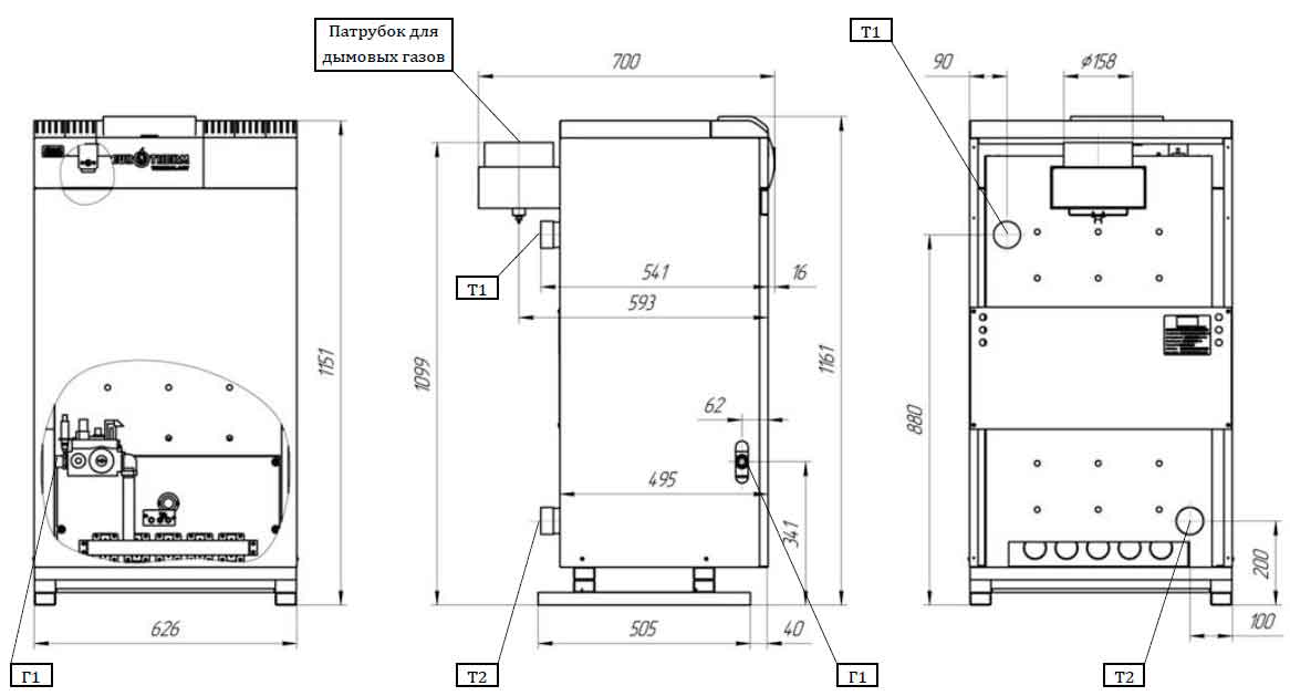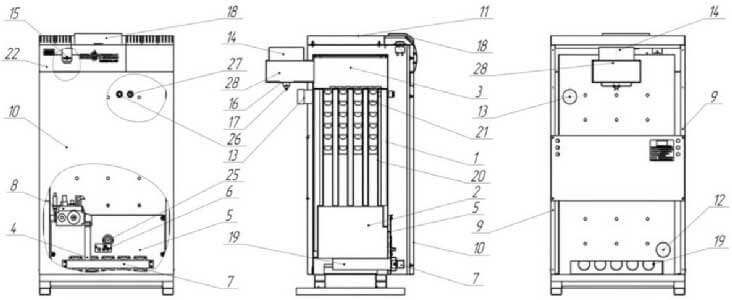 Це серія димохідних підлогових газових котлів потужністю 50 кВт - з п'єзорозпалом (енергонезалежні), які можна підключати каскад. Котловий підлогу оброблений актуальним дизайном, а також гарною обшивкою, яку виробляють за допомогою італійського та німецького обладнання, застосовуючи при цьому порошкове фарбування (нанесення на металеві поверхні порошку з подальшим утворенням шару в печах полімеризації). Усередині котлів знаходяться запатентовані серії теплообмінники особливої будови. Опалювальне обладнання включає зручний пульт управління, газову автоматику (італійського та німецького виробництва), а також інжекційний пальник. Все це робить котли Колві максимально продуктивними та надійними під час робочого процесу. Котли Колві мають три типи газових клапанів, зроблених у Німеччині та Італії. Ще один плюс даних котлів – завдяки модуляційній автоматиці клапана споживання газу зменшується до 20-30 відсотків, порівняно з аналогічним обладнанням. Експлуатація можлива в системі опалення відкритого типу, де природна циркуляція теплового носія, а також в системі закритого типу, що має циркуляційний насос. Під час спільної роботи з топковими котли з потужністю 50 кіловат показали відмінні результати. 1-теплообмінник; 2-топка; 3-збірник продуктів згоряння; 4-газопальникове пристрій; 5-фронтальний лист газопальникового пристрою; 6-блок запальника; 7-газовий колектор із соплами; 8-газовий редуктор (блок клапанів); 9-бокові стінки декоративного кожуха; 10-передня стінка декоративного кожуха; 11-верхня стінка декоративного кожуха; 12 та 13-патрубки під-ключення до системи опалення; 14-патрубок для відведення продуктів згоряння; 15-блок аварійного термостату; 16-стабілізатор тяги; 17-датчик тяги (термостат); 18-пластикова декоративна кришка; 19-пальники; 20-жарові (димогарні) труби; 21-турбулізатори; 22-приладова стінка декоративного кожуха; 23-термоманометр; 24-ручка регулятора термостата; 25-оглядове вікно; 26-гільза з датчиками температури; 27-бобишка для датчика тиску; 28-боковий короб. Т1 – вихід води в систему опалення (пряма вода); Т2 – вхід води із системи опалення (зворотна вода);> p> Г1 – вхід природного газу низького тиску.Газові котли Колви Eurotherm Technology KTH 50 СР