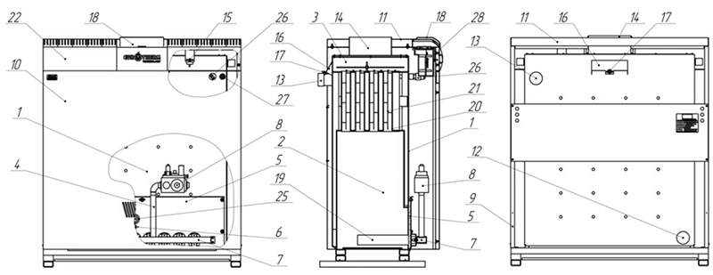 Це серія димохідних газових котлів підлогою потужністю 100 кВт - з електронним керуванням, які можливо підключати каскад. Газовий котел Колвітерм КТН 1.10 - підлоговий котел з електрокеруванням Кови Eurotherm Technology КТН 100 СЕ - має одноблочну конструкцію. Котел підлоговий Колві оброблений актуальним дизайном, а також гарною обшивкою, яку виробляють за допомогою італійської та німецької обладнання, застосовуючи при цьому порошкове фарбування (нанесення на металічні поверхні порошку з подальшим утворенням шару в печах полімеризації). Усередині котлів знаходяться запатентованій серії теплообмінники особливої будови. Опалювальне обладнання включає зручний пульт управління, газову автоматику (італійського та німецького виробництва), а також інжекційний пальник. Все це робить котли Колві максимально продуктивними та надійними під час робочого процесу. Котли Колві мають три типи газових клапанів, зроблених у Німеччині та Італії. Ще один плюс даних котлів – завдяки модуляційній автоматиці клапана споживання газу зменшується до 20-30 відсотків, порівняно з аналогічним обладнанням. Експлуатація можлива в системі опалення відкритого типу, де природна циркуляція теплового носія, а також в системі закритого типу, що має циркуляційний насос. Під час спільної роботи з топковими котли з потужністю 50 кіловат показали відмінні результати. 1 - теплообмінник; 2 – топка; 3 – збірка продуктів згоряння; 4 - газопальниковий пристрій; 5 - фронтальний лист газопальникового пристрою; 6 – блок запальника; 7 - газовий колектор із соплами; 8 – газовий редуктор (блок клапанів); 9 – бічні стінки декоративного кожуха; 10 – передня стінка декоративного кожуха; 11 – верхня стінка декоративного кожуха; 12 та 13 - патрубки підключення до системи опалення; 14 – патрубок для відведення продуктів згоряння; 15 – блок аварійного термостата; 16 – стабілізатор тяги; 17 - датчик тяги (термостат); 18 – пластикова декоративна кришка; 19 - пальники; 20 - жарові (димогарні) труби; 21 - турбулізатори; 22 – приладова стінка декоративного кожуха; 23 – термоманометр; 24 – ручка регулятора термостата; 25 - оглядове вікно; 26 - гільза з датчиками температури; 27 - бобишка для датчика тиску. Т1 – вихід води в систему опалення (пряма вода); Т2 – вхід води із системи опалення (зворотна вода) ; Г1 – вхід природного газу низького тиску.Газові котли Колві Eurotherm Technology КТН 1.100 СЕ