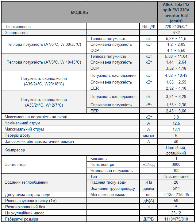 Технічні характеристики теплового насосу Altek PRO 12 split EVI 220V