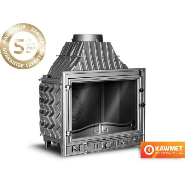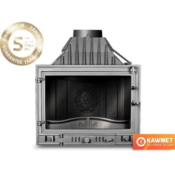Корпус камінної топки W3 (16,7 kW) виготовлений з високоякісного чавуну (клас EN-GJL-200). Камера згоряння закрита дверцятами з термостійкого скла. На дні камери топки розташовані чавунні колосникові грати. Під ґратами знаходиться бляшана попільничка. Передня частина зольного ящика оснащена первинною повітряною заслінкою, необхідною для спалювання палива. Повітряна заслінка може бути переміщена в два крайні положення та використовується для регулювання подачі кількості повітря в камеру згоряння. Камінна топка оснащена регулюванням тяги в димарі за допомогою валу в положенні важеля регульованого до існуючої тяги димоходу. Конструкція каміна KAWMET W3 (16,7 kW) передбачає використання виключно одного виду палива - це дрова листяних порід дерев, з високою калорійністю (дрова дуба, граба, бука тощо). Дрова хвойних порід використовувати не рекомендується, так як такий вид палива містить багато смол, які сильно забруднюють оглядове скло та димохід. Крім того, паливо для камінної топки Кавмет має містити вологість не менше 20%. Деревина зі збільшеною вологістю викликає погане згоряння і швидке забруднення скла та димоходу. Особливості монтажу камінної топки KAWMET W3 (16,7 kW) catalog/Tovar/KAWMET/1.jpg"> Купити камінну топку KAWMET W3 (16 ,7 kW), Ви можете у нас в офісі, або оформити замовлення через кошик з доставкою по Києву або по Україні.Камінна топка KAWMET W3 (16,7 kW) - особливості моделі