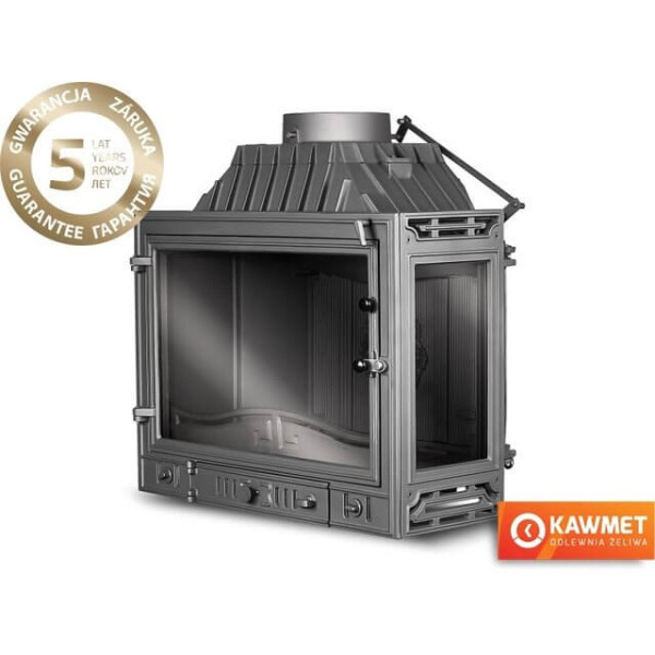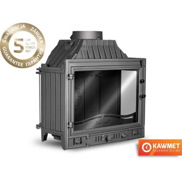 Корпус камінної топки KAWMET W4 з лівим бічним склом (14,5 kW) виготовлений з високоякісного чавуну (клас EN-GJL-200 ). Камера згоряння закрита дверцятами з термостійкого скла. На дні камери топки розташовані чавунні колосникові грати. Під ґратами знаходиться бляшана попільничка. Передня частина зольного ящика оснащена первинною повітряною заслінкою, необхідною для спалювання палива. Повітряна заслінка може бути переміщена в два крайні положення та використовується для регулювання подачі кількості повітря в камеру згоряння. Камінна топка оснащена регулюванням тяги в димарі за допомогою валу в положенні важеля регульованого до існуючої тяги димоходу. Конструкція каміна KAWMET W4 з лівим бічним склом (14,5 kW) передбачає використання виключно одного виду палива – це дрова листяних порід дерев, з високою калорійністю (дрова дуба, граба, бука тощо). Дрова хвойних порід використовувати не рекомендується, так як такий вид палива містить багато смол, які сильно забруднюють оглядове скло та димохід. Крім того, паливо для камінної топки Кавмет має містити вологість не менше 20%. Деревина зі збільшеною вологістю викликає погане згоряння і швидке забруднення скла та димоходу. :/image/catalog/Tovar/KAWMET/1.jpg"> Купити камінну топку KAWMET W4 з лівим бічним склом (14,5 kW), Ви можете у нас в офісі, або оформити замовлення через кошик з доставкою по Києву або по Україні.Камінна топка KAWMET W4 з лівим бічним склом (14,5 kW) - особливості моделі