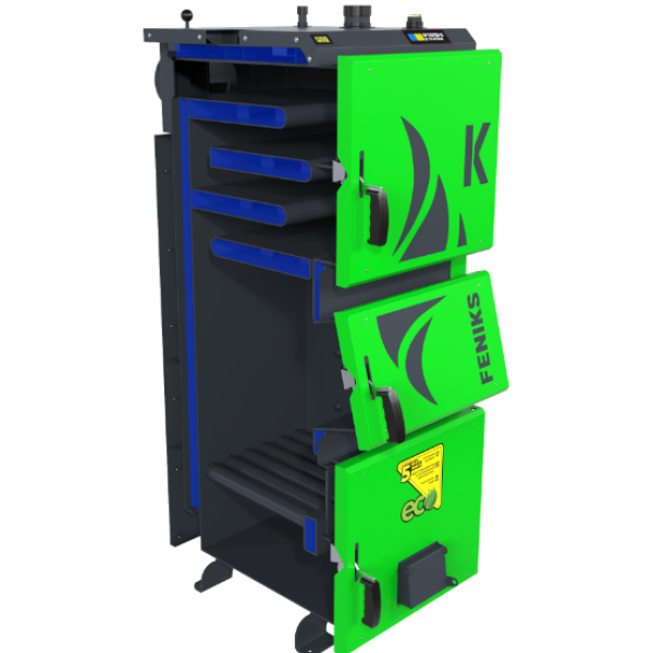 Котел Feniks (Фенікс) серія K 12 кВт розроблений як котел тривалого горіння з ручним завантаженням палива. Камера згоряння має закриту конструкцію, що забезпечує безпечне використання та мінімізує втрати тепла. Завантаження палива здійснюється через зручні фронтальні дверцята, а конструкція колосників — водонаповнена, що покращує передачу тепла до теплоносія.
