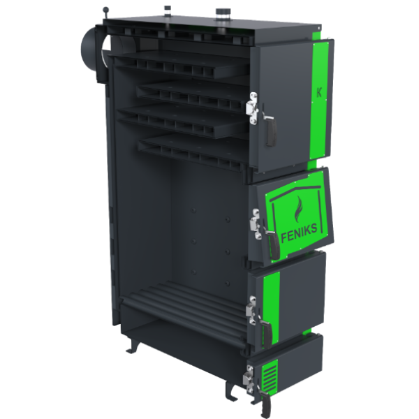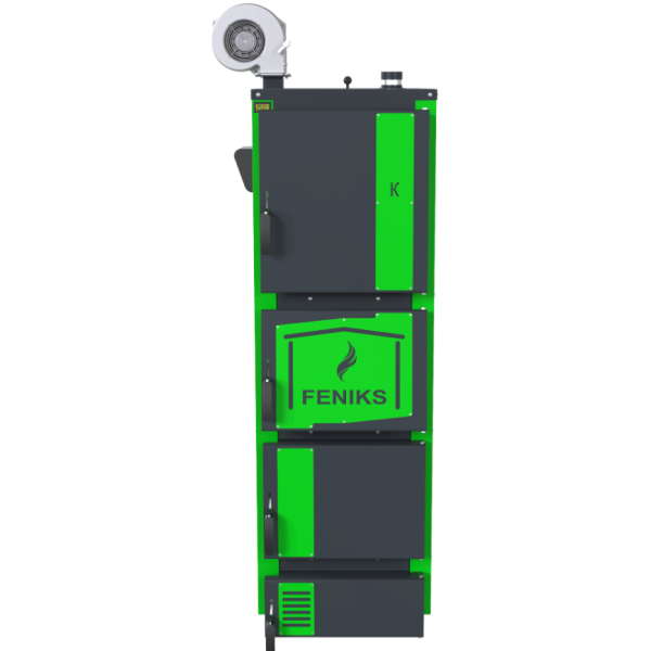 Котел Feniks (Фенікс) серія K 50 кВт розроблений як котел тривалого горіння з ручним завантаженням палива. Камера згоряння має закриту конструкцію, що забезпечує безпечне використання та мінімізує втрати тепла. Завантаження палива здійснюється через зручні фронтальні дверцята, а конструкція колосників — водонаповнена, що покращує передачу тепла до теплоносія.