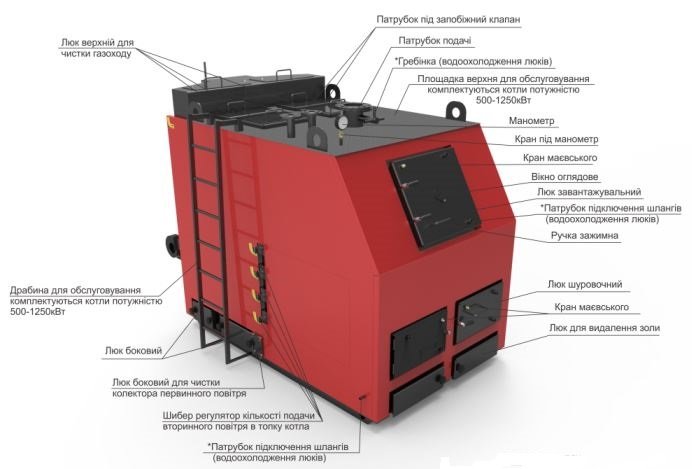 Твердопаливні котли Ретра-3М - це інноваційні високоефективні твердопаливні котли з разовим завантаженням палива від 7 до 36 годин. Котли Ретра-3М використовують для опалення житлових комплексів, адміністративних будівель, комерційних приміщень, теплиць і т.д. Належать вони до серії котлів-утилізаторів. Котел працює на будь-якому виді твердого палива, а також на деревині з підвищеною вологістю, від 60% і вище. Промислові котли Ретра-3М випускаються у лінійці від 250 до 1150 кВт. Котел комплектується нагнітальним вентилятором первинного та вторинного повітря, а також контролером управління. Товщина стінок топки котла виконана зі спеціалізованої технічної сталі товщиною 8 мм. У нижній частині котла розташовані колосники, обладнані розпушувачем. Теплообмінник котла має структуру із трьох камер. Перша – це об'ємна камера згоряння, де відбувається сам процес горіння. У другій камері відбувається активний відбір тепла із газоподібних продуктів горіння. Третя камера служить для відведення з котла відпрацьованих димових газів. У цій камері відбувається передача залишків тепла на теплообмінник. У передній частині котла розташовуються технологічні люки – завантажувальні дверцята та дверцята зольного відсіку. Зверху котла, в задній частині розташовується ще один люк ревізійний, для чищення конвекційних каналів від сажі. Для візуалізації робочого тиску встановлюється манометр. Процес горіння в котлі управляється за допомогою електронного контролера. Він сам контролює та аналізує поточний стан системи, інтенсивність зростання температури та температуру теплоносія. Регулятор керує насосами центрального опалення та гарячого водопостачання. Купити котел Ретра-3М 900 кВт Ви можете у нас в офісі, або оформити замовлення через кошик з доставкою по Києву або в будь-яку точку України.Ретра-3М 900 кВт - твердопаливний сталевий котел для промислового використання
