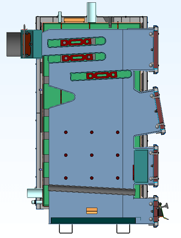 - Міцну конструкцію. Товщина сталі в теплообміннику — 6 мм. Використовується жаростійка котлова сталь, що забезпечує тривалий термін експлуатації.