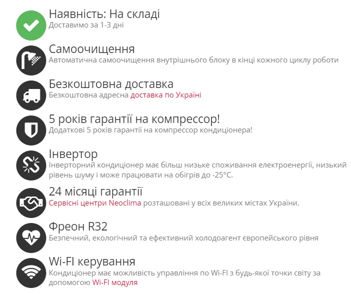 Якщо ви шукаєте надійний та ефективний кондиціонер для вашого дому, то Neoclima SKYCOLD - це те, що вам потрібно. Цей пристрій поєднує в собі високу якість, сучасний дизайн та передові технології, що робить його ідеальним вибором для будь-якого приміщення. Однією з ключових переваг кондиціонера Neoclima SKYCOLD є його висока ефективність. Завдяки потужному компресору та оптимізованій системі охолодження, він здатен швидко знижувати температуру в приміщенні навіть у найспекотніші дні. Крім того, цей кондиціонер оснащений інтелектуальною системою контролю температури, яка автоматично регулює режим роботи пристрою для забезпечення оптимального комфорту. Neoclima SKYCOLD також відзначається своєю надійністю та довговічністю. Він виготовлений з високоякісних матеріалів, що забезпечує його довговічну роботу без втрати продуктивності. Крім того, цей кондиціонер має енергоефективний клас, що дозволяє економити електроенергію та знижувати витрати на оплату комунальних послуг. Особливо слід відзначити сучасний дизайн Neoclima SKYCOLD. Він має компактні розміри та стильний зовнішній вигляд, що дозволяє гармонійно вписатися в будь-який інтер'єр. Крім того, цей кондиціонер оснащений пультом дистанційного керування, що забезпечує зручне управління пристроєм з будь-якої точки приміщення. Замовляйте кондиціонер Neoclima SKYCOLD в нашому інтернет-магазині прямо зараз і насолоджуйтеся комфортом та прохолодою у вашому домі!Кондиціонер Neoclima SKYCOLD - ідеальний вибір для вашого дому!