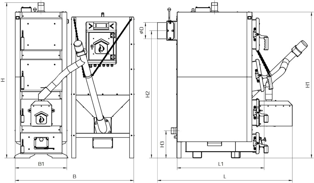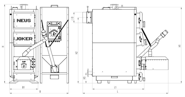 Параметр Од. виміру Норма для котла Неус Джокер Номінальна потужність котла кВт 24 27 36 40 50 60 75 98 120 150 200 250 Габаритні розміри котла B, мінімум мм 1150 1190 1190 1235 1345 1410 1410 1765 1765 1910 2105 2300 B1 500 540 540 585 585 650 650 865 865 865 1065 1265 H 1520 1520 1650 1750 1800 1800 1800 2020 2020 2020 2020 2020 H1 1425 1425 1550 1650 1700 1700 1700 1900 1900 1900 1900 1900 Н2 1242 1243 1367 1467 1517 1515 1515 1685 1685 1685 1660 1660 Н3 265 265 265 266 268 266 238 258 265 265 278 278 L 1320 1370 1420 1440 1480 1625 1965 2135 2210 2390 2460 2665 L1 850 890 940 940 980 1030 1130 1200 1270 1370 1570 1730 D 159 178 178 178 219 245 245 298 298 298 348 Чому варто обрати котел пелетний Neus Джокер Пелет (Joker Pellet) 120 кВт?