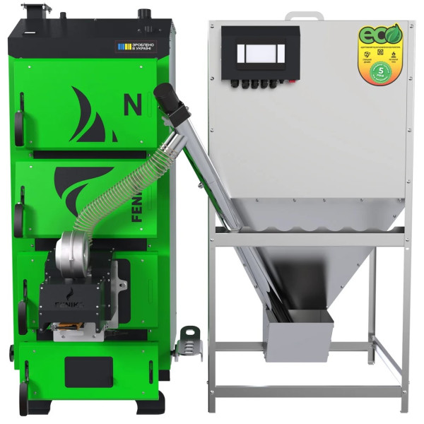 Пелетний котел Feniks серія N pellet 10 кВт — це сучасний твердопаливний котел з автоматичною подачею палива, створений для ефективного та економного опалення житлових і комерційних об’єктів. Модель поєднує високу енергоефективність, продуману конструкцію та зручність експлуатації, що робить її оптимальним вибором для користувачів, які прагнуть мінімізувати ручну роботу та отримати стабільний тепловий результат. Котел розрахований на опалення приміщень площею до 100 м², що дозволяє використовувати його у приватних будинках, котеджах, невеликих виробничих приміщеннях, СТО, майстернях, складах або адміністративних будівлях. Пелетний котел Feniks серія N pellet орієнтований на власників, які цінують автоматизацію процесів, прогнозовані витрати на опалення та надійну роботу обладнання протягом усього опалювального сезону. Пелетний котел Feniks серія N pellet 10 кВт має низку конструктивних та функціональних переваг, які вигідно відрізняють його серед аналогів у своєму класі: Пелетний котел Feniks серія N pellet розроблений з урахуванням сучасних вимог до автоматизованих систем опалення. Основна концепція моделі — мінімальна участь користувача та максимальна стабільність теплопостачання. Котел працює на деревних та агропелетах, що дозволяє обирати оптимальний тип палива залежно від доступності та бюджету. Завдяки автоматичній подачі пелет з бункера, користувачеві не потрібно регулярно контролювати процес горіння або часто дозавантажувати паливо. Серцем системи є пелетний пальник, який забезпечує рівномірне та контрольоване згоряння. Електронне управління аналізує робочі параметри та автоматично коригує подачу палива, підтримуючи задану температуру в системі опалення. Це особливо важливо для комерційних і промислових об’єктів, де стабільність тепла має критичне значення. Теплообмінник виготовлений зі сталі товщиною 5 мм, що забезпечує оптимальне співвідношення теплопередачі та механічної міцності. Така конструкція дозволяє котлу ефективно нагрівати теплоносій та підтримувати робочі параметри навіть при тривалому навантаженні. Закрита камера згоряння мінімізує теплові втрати та підвищує рівень безпеки. Чавунна колосникова решітка добре переносить високі температури та забезпечує стабільну роботу котла протягом усього терміну експлуатації. Котел має фронтальне завантаження, компактну, але містку конструкцію та продуману компоновку, що полегшує монтаж і технічне обслуговування. Для додаткового комфорту користувач може встановити Wi-Fi модуль, який дозволяє контролювати роботу котла дистанційно — з будь-якої точки, де є доступ до інтернету. Комплектація У стандартну комплектацію пелетного котла Feniks серія N pellet 10 кВт входить: Це дозволяє швидко ввести котел в експлуатацію без необхідності додаткових витрат. Пелетний котел Feniks серія N pellet 10 кВт — це надійне, автоматизоване та економічно вигідне рішення для опалення житлових і комерційних об’єктів. Він поєднує сучасні технології, високу ефективність та зручність у використанні, дозволяючи отримати стабільне тепло з мінімальними витратами часу та ресурсів. Обираючи пелетний котел Feniks серія N pellet, ви інвестуєте у комфортне, прогнозоване та сучасне опалення українського виробництва.Пелетний котел Feniks серія N pellet 10 кВт — автоматизоване опалення для стабільного тепла