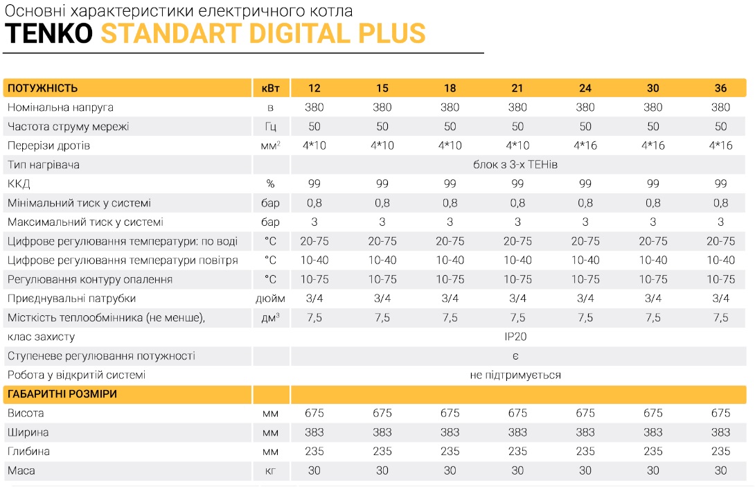 Електричний котел Tenko Cтандарт Digital Plus – надійний та ефективний вибір для опалення вашого будинку. Цей котел володіє численними перевагами, які роблять його одним з кращих варіантів на ринку опалювального обладнання. Почнемо з його основних характеристик. Tenko Cтандарт Digital Plus має потужність від 3 до 12 кВт, що робить його ідеальним вибором як для невеликих, так і для середніх приміщень. Крім того, цей котел оснащений цифровим дисплеєм, який дозволяє легко контролювати та налаштовувати його роботу. Однією з головних переваг Tenko Cтандарт Digital Plus є його ефективність. Завдяки використанню передової технології, цей котел забезпечує швидке та рівномірне опалення приміщення, що дозволяє зекономити електроенергію та знизити витрати на опалення. Крім того, Tenko Cтандарт Digital Plus має компактний дизайн, що дозволяє з легкістю встановити його в будь-якому приміщенні. Його надійна конструкція забезпечує довгий термін служби, що робить його вигідним вибором для будь-якого споживача. Крім того, цей котел оснащений численними захисними системами, що забезпечують безпеку та надійність його роботи. Це дозволяє споживачам мати повну впевненість у тому, що їхнє опалення буде працювати безперебійно та безпечно. Узагальнюючи, Tenko Cтандарт Digital Plus – це надійний, ефективний та безпечний вибір для опалення будь-якого приміщення. Його передові технології, компактний дизайн та надійна конструкція роблять його одним з кращих варіантів на ринку. Якщо ви шукаєте надійний котел, який забезпечить ефективне опалення та зекономить ваші витрати на електроенергію, то Tenko Cтандарт Digital Plus – це той варіант, на який варто звернути увагу.Електричний котел Tenko (Тенко) Cтандарт Digital Plus, 21 кВт, 380В
