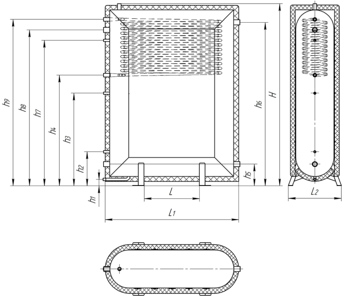 h4, h9 – патрубки підключення верхнього теплообмінника.Технічні характеристики плоских буферних ємностей Neus з двома теплообмінниками
