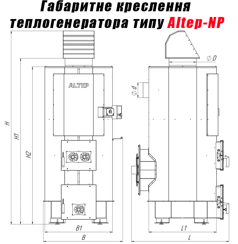 Параметр Од. вим. 35 кВт 50 кВт 70 кВт Висота (H) мм 1500 1600 1700 Ширина (B) мм 800 900 1000 Глибина (L) мм 1000 1100 1200 Діаметр димоходу (D) мм 200 220 240
