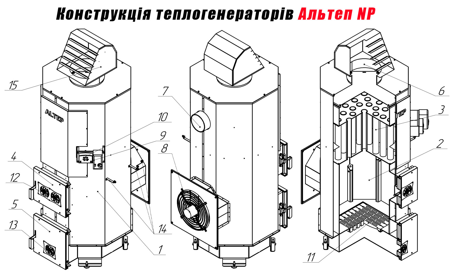 Теплогенератор ALTEP NP 35 кВт – це сучасне рішення для тих, хто цінує стабільне тепло, економічність та надійність. Завдяки високому ККД (до 90%), він забезпечує швидкий прогрів приміщень площею до 350 м², використовуючи доступне тверде паливо – дрова, вугілля чи брикети. Такий агрегат стане оптимальним вибором для власників приватних будинків, СТО, майстерень, складів, магазинів або комунальних закладів, які шукають простий в експлуатації та ефективний спосіб опалення. Теплогенератор ALTEP NP 35 кВт має збільшену топкову камеру, що дозволяє завантажувати великі поліна чи великі об’єми вугілля. Герметична камера згорання зводить до мінімуму теплові втрати, а регульована система подачі повітря забезпечує рівномірне спалювання палива. Особливу увагу виробник приділив надійності. Чавунні колосники не деформуються при високих температурах, що продовжує термін служби генератора. Завдяки продуманій конструкції, теплогенератор не вимагає складного догляду – достатньо регулярного очищення від золи та контролю якості палива. Система управління проста й зрозуміла, тому з експлуатацією впорається навіть користувач без спеціальних технічних знань. Для бажаючих автоматизувати роботу передбачена можливість підключення додаткових систем регулювання. 1. Корпус теплогенератора 2. Камера згоряння (топка) 3. Конвекційна частина (теплообмінник) 4. Дверцята завантажувальні 5. Дверцята зольного ящика 6. Патрубок виходу теплого повітря 7. Димохід 8. Вентилятор 9. Регулятор швидкості обертання вентилятора 10. Пульт керування 11 Чавунні колосники 12. Заслінки подачі вторинного повітря 13. Заслінки подачі первинного повітря 14. Тримачі кабелю вентилятора 15. Направляюче коліно Теплогенератор ALTEP NP 35 кВт – це надійний та ефективний теплогенератор, який поєднує високу продуктивність, простоту використання та економічність. Він стане чудовим вибором для тих, хто хоче отримати максимальну віддачу від свого опалювального обладнання без зайвих витрат та складностей у догляді. Обираючи ALTEP NP, ви інвестуєте у довговічність, комфорт та стабільне тепло у вашому приміщенні.Теплогенератор ALTEP NP 35 кВт – ефективне опалення для дому та бізнесу